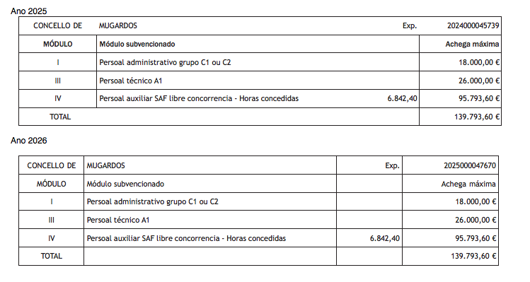 La Diputación Provincial de A Coruña subvenciona al Concello de Mugardos, para financiar los servicios sociales comunitarios, desde hace más de 20 años, siendo la última concesión la del año 2025 (BOP núm. 59 del 27/03/2025) y estando concedida provisionalmente para el presente año 2026 (BOP núm. 20 del 30/01/2026):