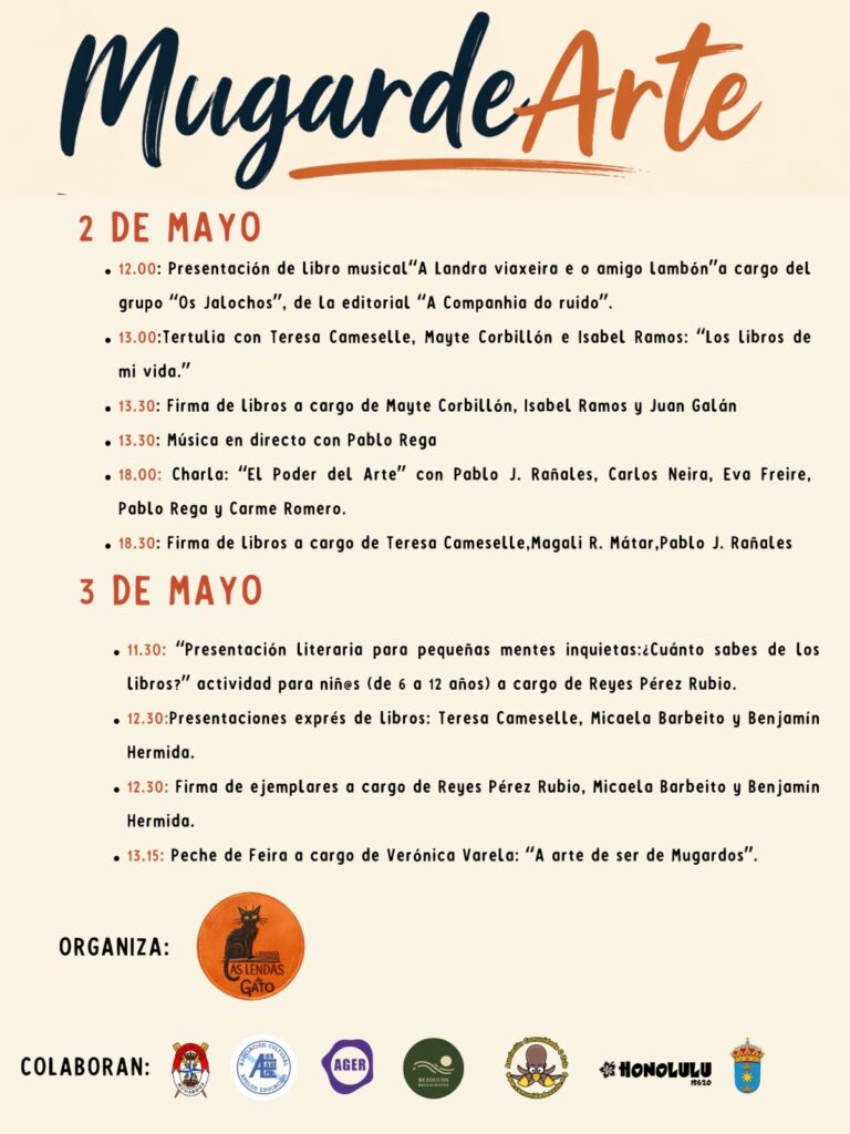 O Cantón de Cora acollerá este fin de semana, o sábado 2 e o domingo 3 de maio, o Festival Cultural ‘MugardeArte’ no que haberá charlas, contacontos, firma de libros, música, tertulias e por suposto, moita literatura.