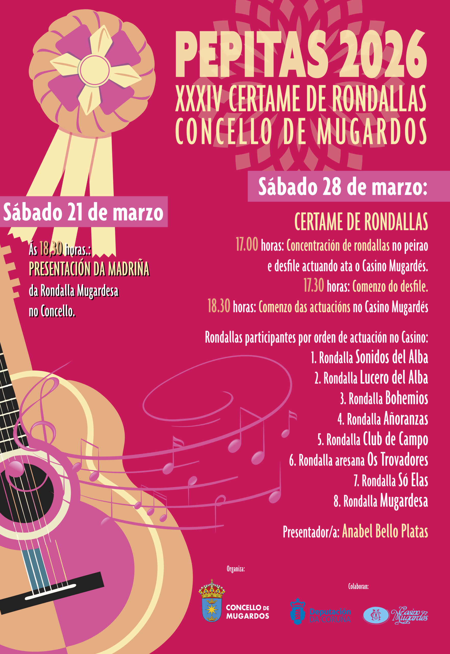 Posteriormente, o sábado 28 de marzo celebrarase o Certame de Rondallas, que terá lugar nas instalacións do Casino Mugardés, reunindo a distintas agrupacións que forman parte desta tradición musical profundamente arraigada na comarca.